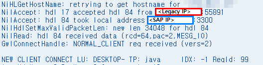 You can see the IPs and ports as shown below. JCo uses port 33XX (e.g., 3300 for instance number 00), which is the SAP Gateway port used to establish the connection.